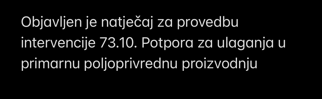 Objavljen je natječaj za provedbu intervencije 73.10. Potpora za ulaganja u primarnu poljoprivrednu proizvodnju